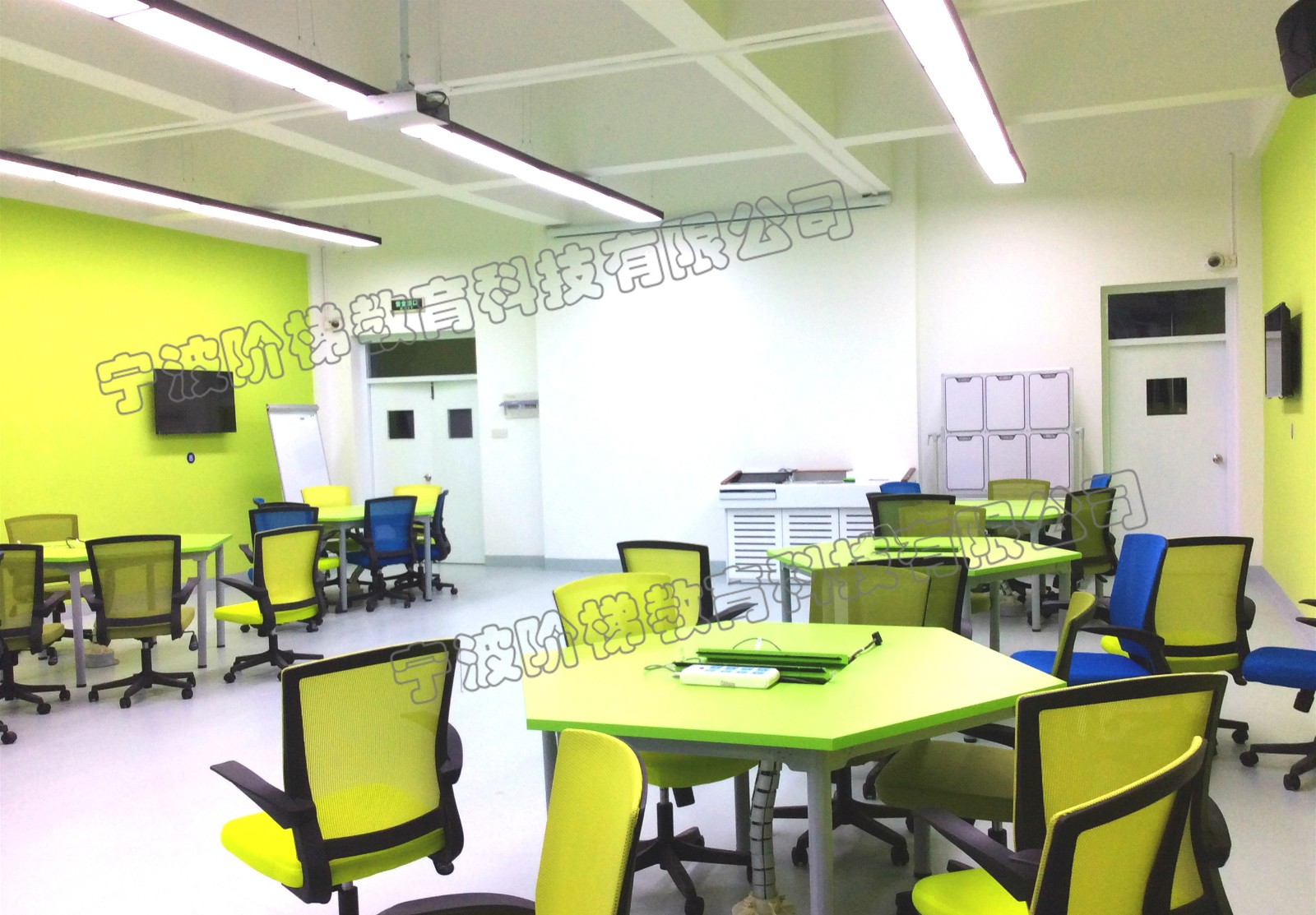 9號教學樓三樓是翻轉課堂的專門教學區域,淺綠色的教室墻壁掛著大屏幕投影儀,8張長約3米,寬約1.5米的果綠色固定課桌,每張課桌旁都掛著一臺小電視,上面能清晰看到投影儀上的內容。白色的講臺,綠色的桌子,藍色的轉椅,顏色搭配清新干凈。藍色的轉椅可自由轉動,學生上課時能溫馨地圍坐在一起,還可以自由轉動到別的課桌討論問題,這就是大紅鷹學院的“翻轉課堂”教室。