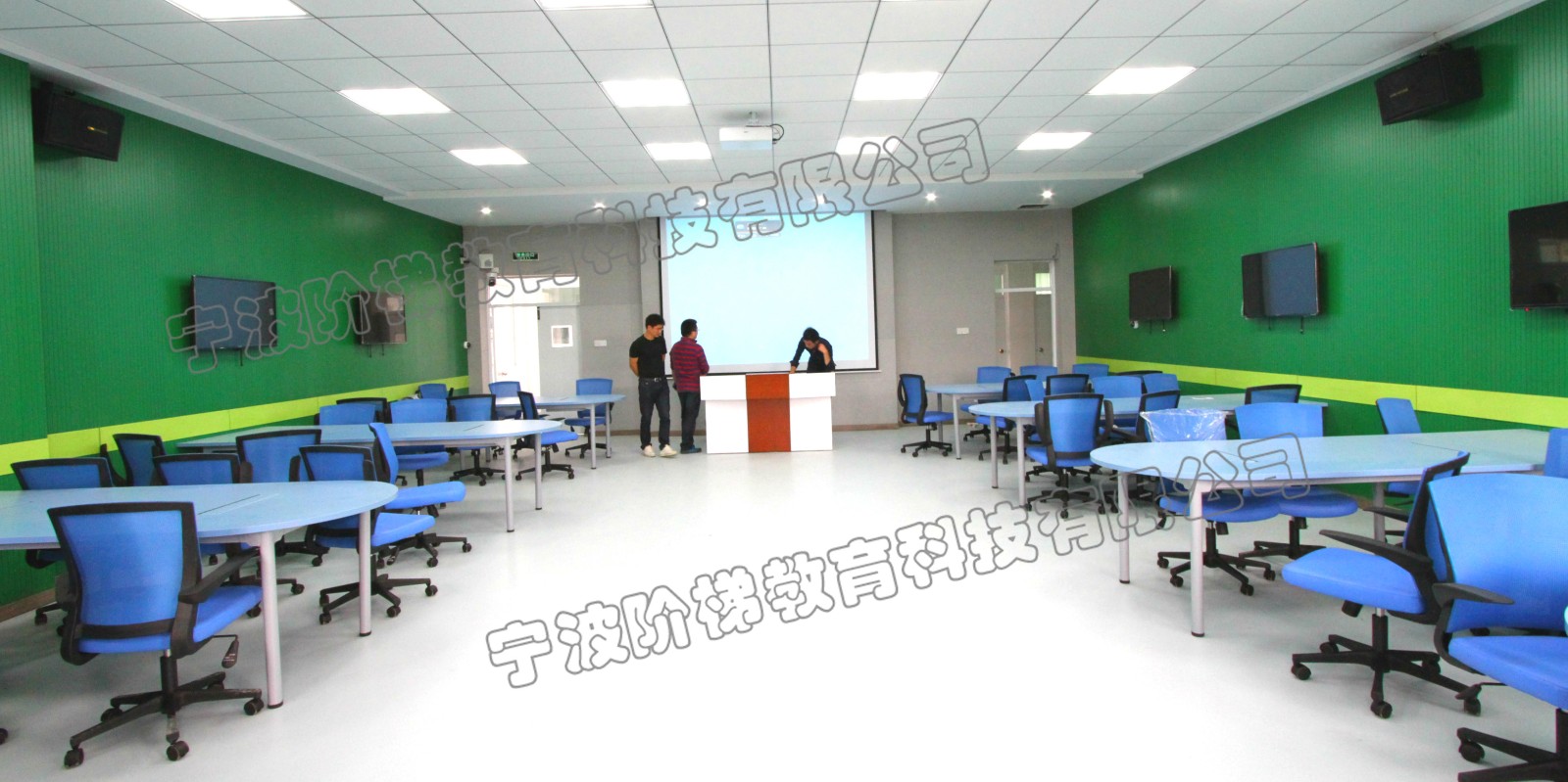 課代表胡揚帆同學對翻轉課堂有了初次體會,“我很驚訝,教室出奇的大!桌椅很漂亮!”在普通的大教室,坐在后面的學生聽課會看不清黑板,而翻轉課堂的教室配備了8臺電視投影儀,每張課桌都有一臺,就算是視力不好的同學聽課也絲毫不費勁。墻壁以護眼的綠色為主,看著很柔和舒服。教室還配備無線話筒,聲音小的學生上臺講話下面同學也能聽得很清楚。